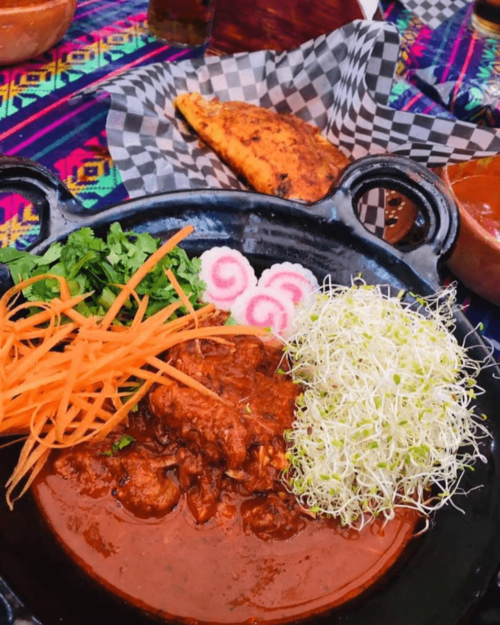 Pasta de ramen con birria, germen, zanahoria rayada, cebolla, cilantro y naruto.
