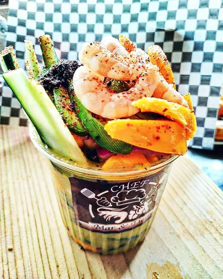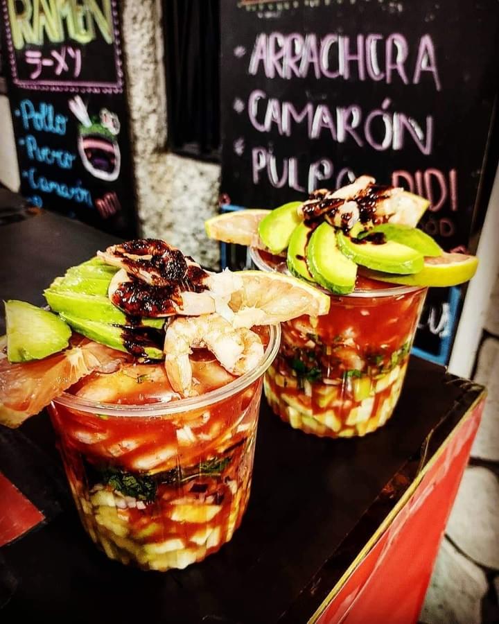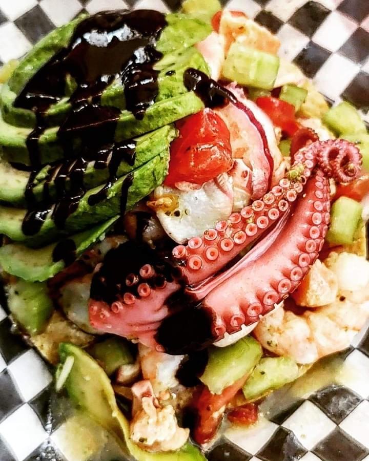 Tostada de camarón y pulpo, con base de pepino, cebolla, jitomate y aguacate.