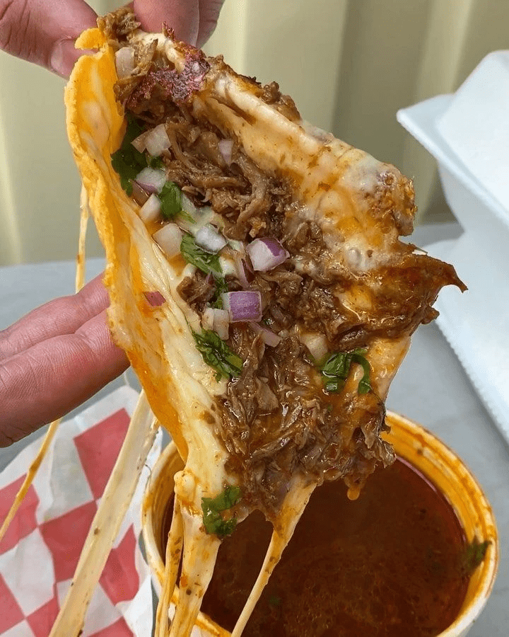 Orden de 3 pz. de quesabirrias con tortilla de harina, queso gouda, cebolla, cilantro y un consomé