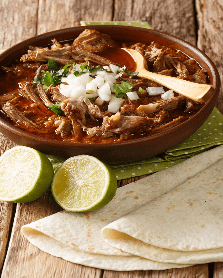 Plato de birria 1Lt. cebolla, cilantro, tortillas.